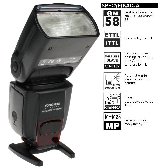 Tryby pracy: E-TTL / E-TTLII, Manual, MULTI,